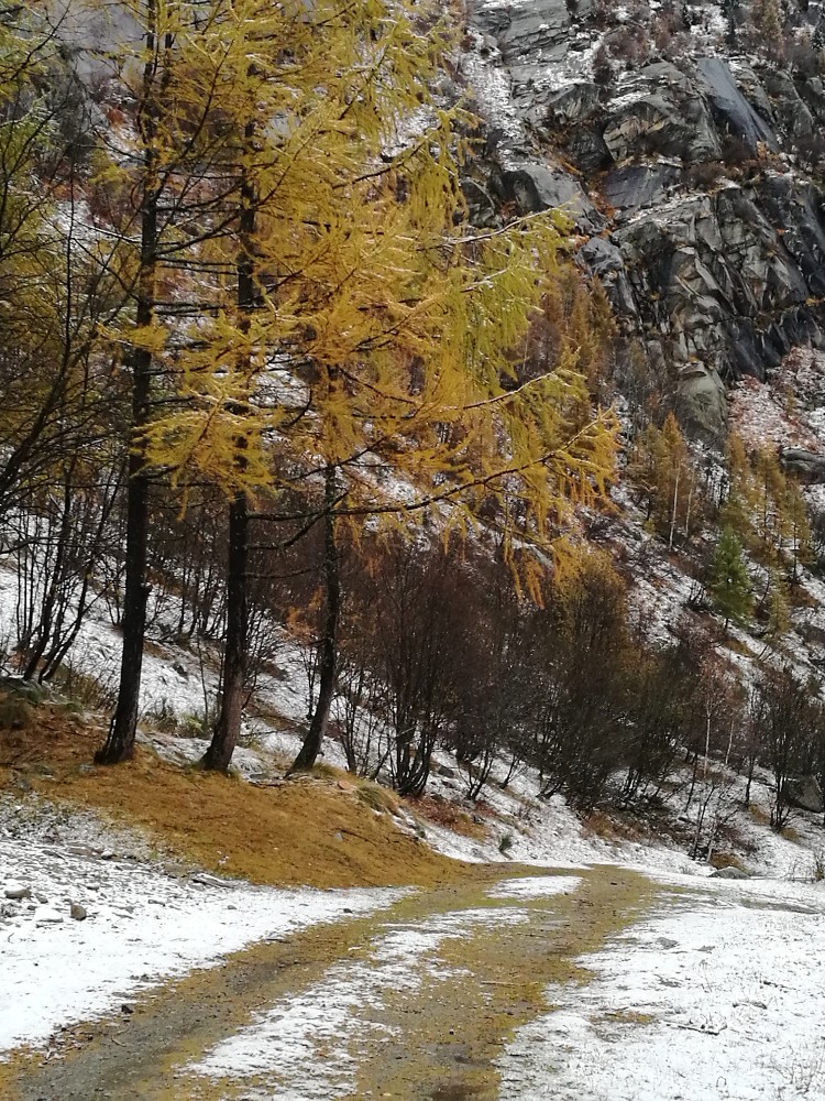 Purtroppo ne è scesa poca e, quindi, niente palle di neve. Una spolverata zuccherina comunque piacevole con il giallo dei larici. Eccola: