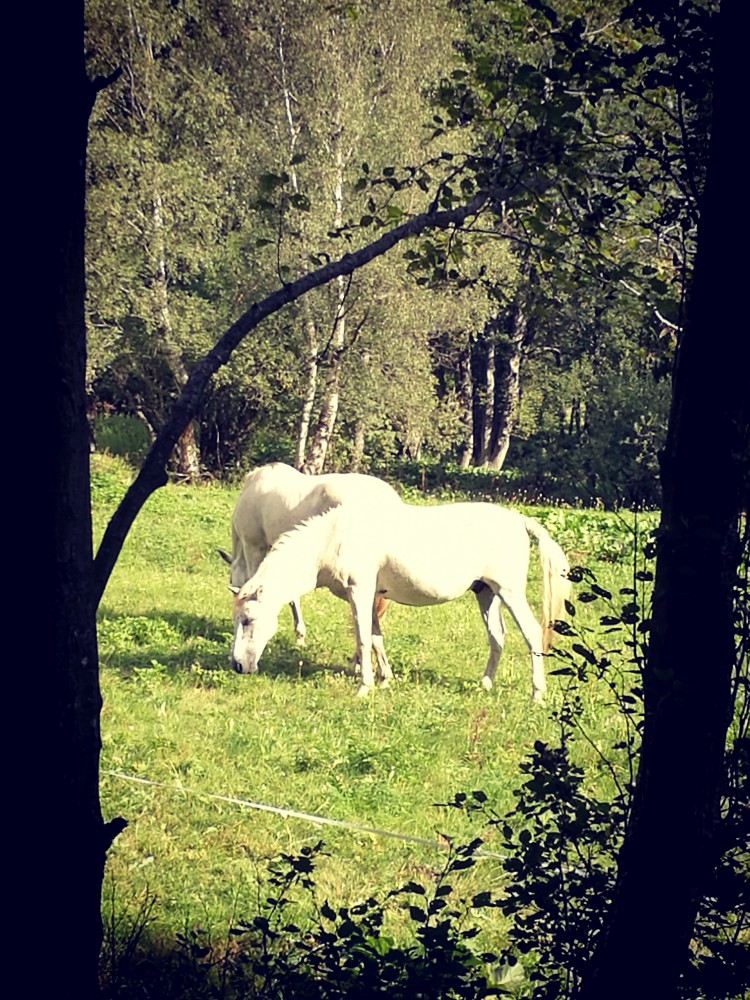 Pare che qui non manchino animali. Si può dire che conviviamo con essi. Fanno parte del paesaggio e della nostra quotidianità. Nel paese vicino pascolano dei magnifici cavalli bianchi che passano sotto le mie finestre per tutto il periodo estivo cavalcati da cavallerizzi in tenuta perfetta. Ho trovato tre ferri di cavallo nelle passeggiate che tengo sulla credenza: non si sa mai che portino fortuna.