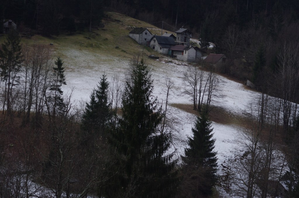 Sulla radura la galaverna lascia polvere zuccherina. Le baite dormono cullate dal silenzio. Il tenue verde sospira lento prima della morsa del gelo.