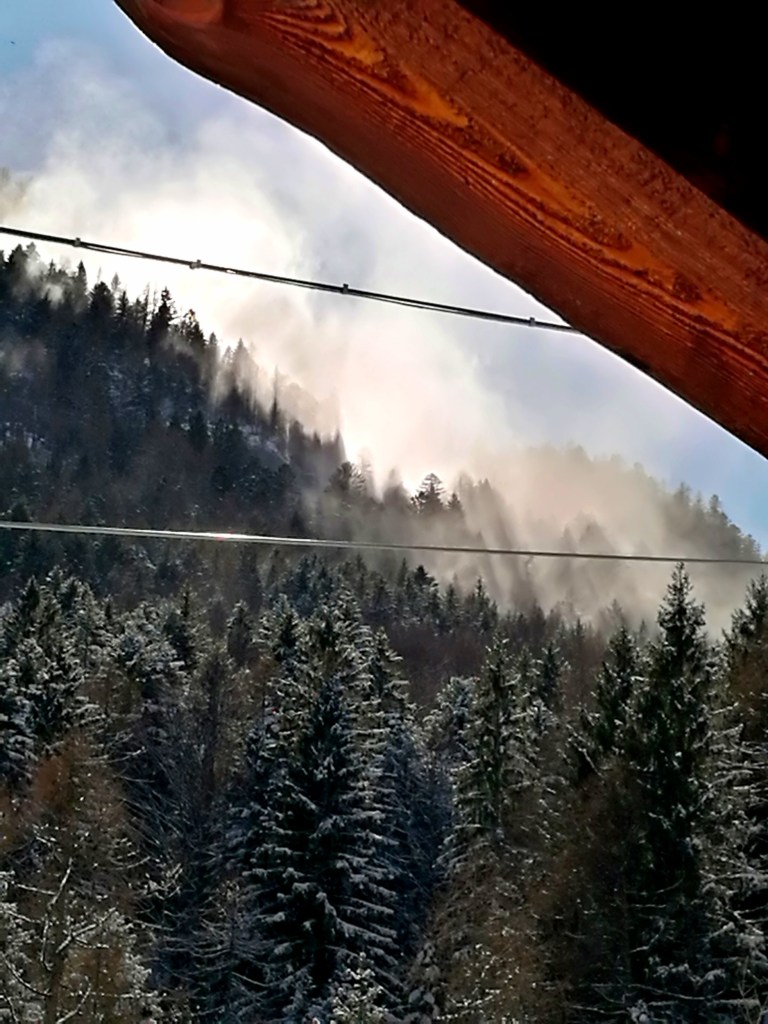Dopo pranzo si è alzato il vento. Con la danzante veste ha sconvolto la pineta facendo volare nuvole di neve. Meraviglioso spettacolo.
