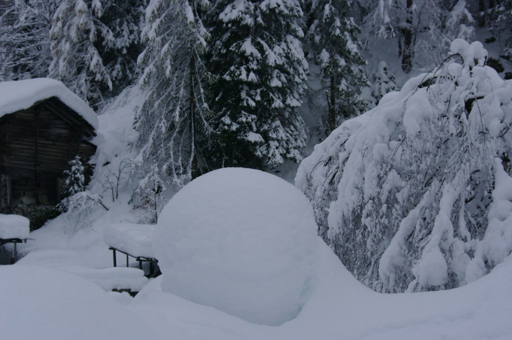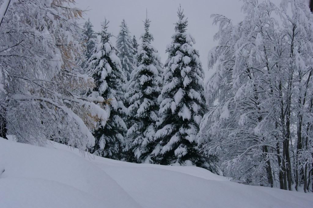 non è facile fotografare il bianco, si rischia l’appiattimento dell’immagine. tu ci sei riuscita egregiamente cercando il contrasto del verde cupo dei pini e del bruno della baita.