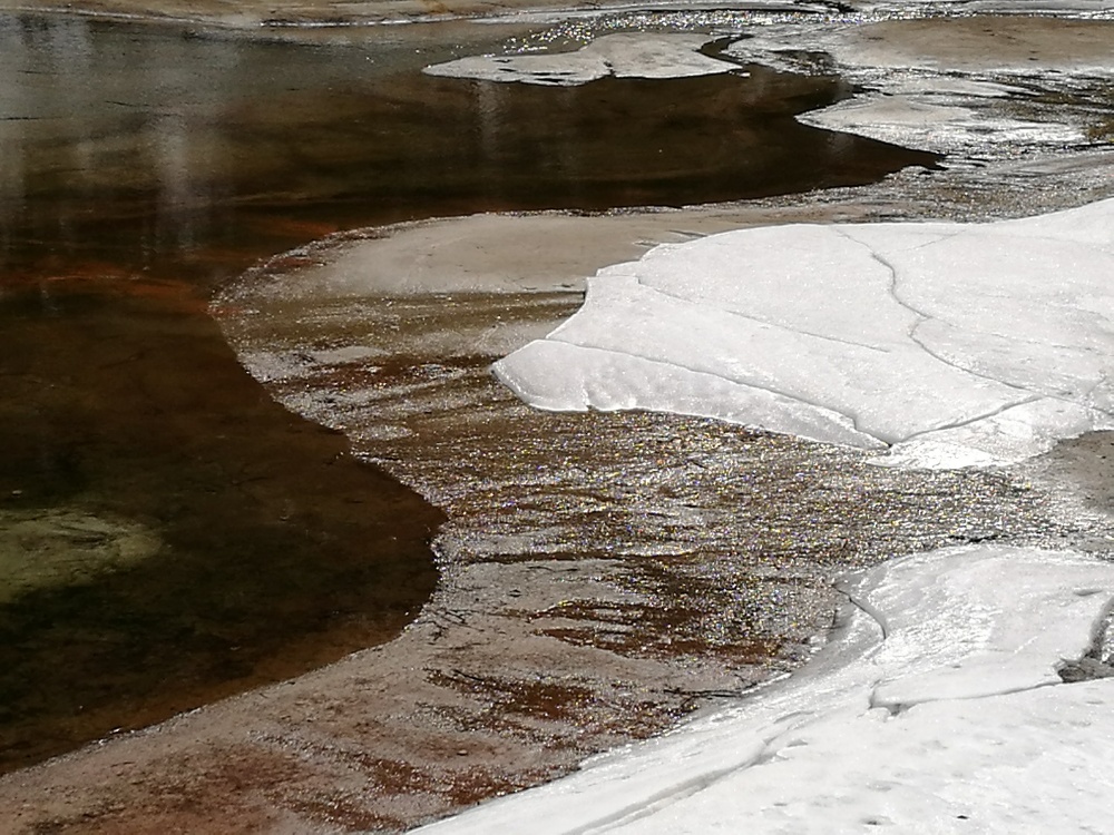 Qui è stato ed è un inverno molto nevoso e il ghiaccio è ancora molto presente sui sentieri. Così cammino con i ramponi sotto gli scarponcini e un bastone con molta calma e attenzione ( è mio desiderio dopo 40 giorni guarire e non tornare a cadere).