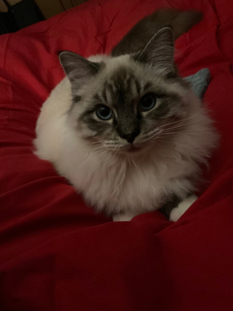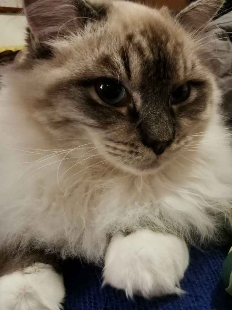 Oggi invece non mi lascia stare un minuto. Sempre su di me. Sempre accanto a me. Sempre a cercare coccole e fare ron ron. I Ragdoll – bambole di pezza – sono gatti/cani. Si affezionano più al padrone che alla casa. Mi diverte molto prenderlo sulla spalla con il lungo peloso corpo cadente.