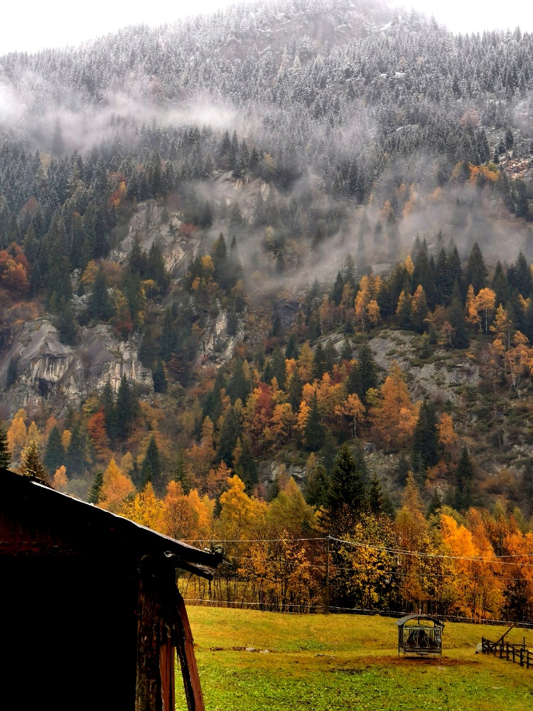 Così ha commentato mia figlia all’invio di questa immagine. Eh, già. A fine ottobre ha fatto la sua prima comparsa la neve! Ha imbiancato le montagne intorno. Qui nevischiava.