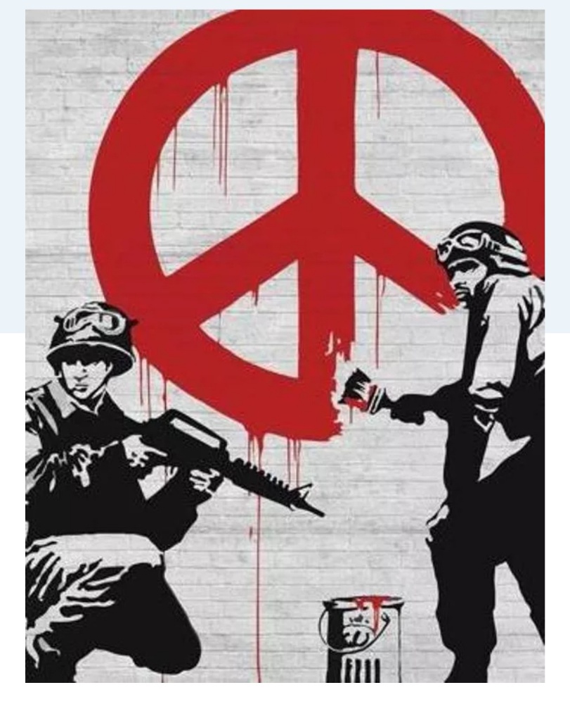 Sono veramente contenta di aver raccontato di Banksy – dopo aver visto una sua mostra a Otranto a settembre. Mi sembrava strano che non ci fosse in questo momento purtroppo bellico, di morte sopraffazione e violenza. Invece leggo sul Corriere che ha deciso di vendere una delle sue innumerevoli opere contro la guerra.