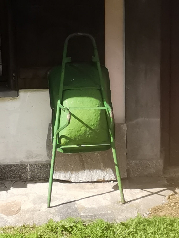 Persino una carriola, strumento qui molto usato per il trasporto dei ciocchi di legna, si è adeguata…
