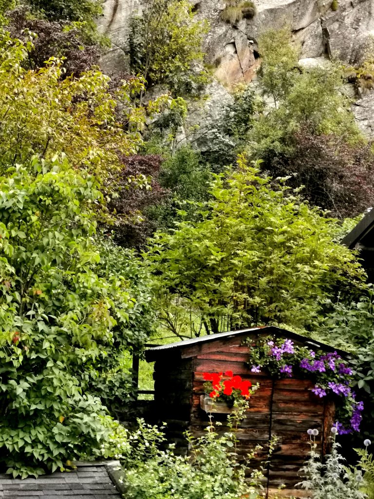 Tamburella la pioggia su tutto. Sul tetto sulle piante e fiori del giardino sulla casetta in legno sulla stradina. Odore di temporale ferragostiano. Odore buono, di terra bagnata. Tutto è scuro e saturo di acqua.