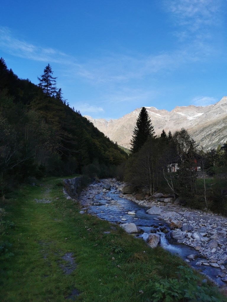 Alle nove il sole è solo apparso dietro le cime e il bosco è ancora in ombra. Il ruscello rispecchia la luce azzurra del cielo.