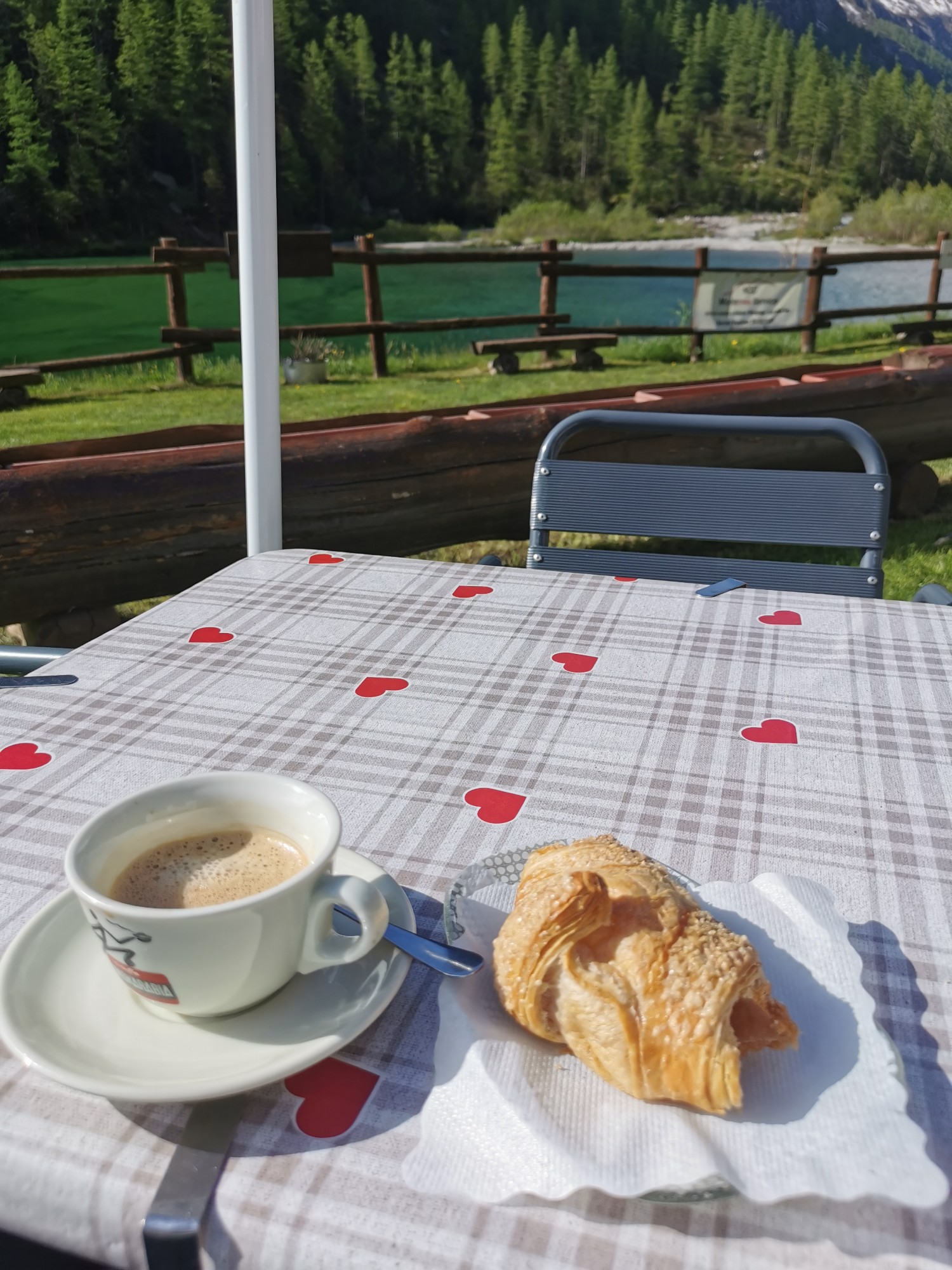 Vado su. Sono sempre la prima a sedermi al rifugio. La proprietaria mi porta la colazione e mi gusto il lago e due chiacchiere.