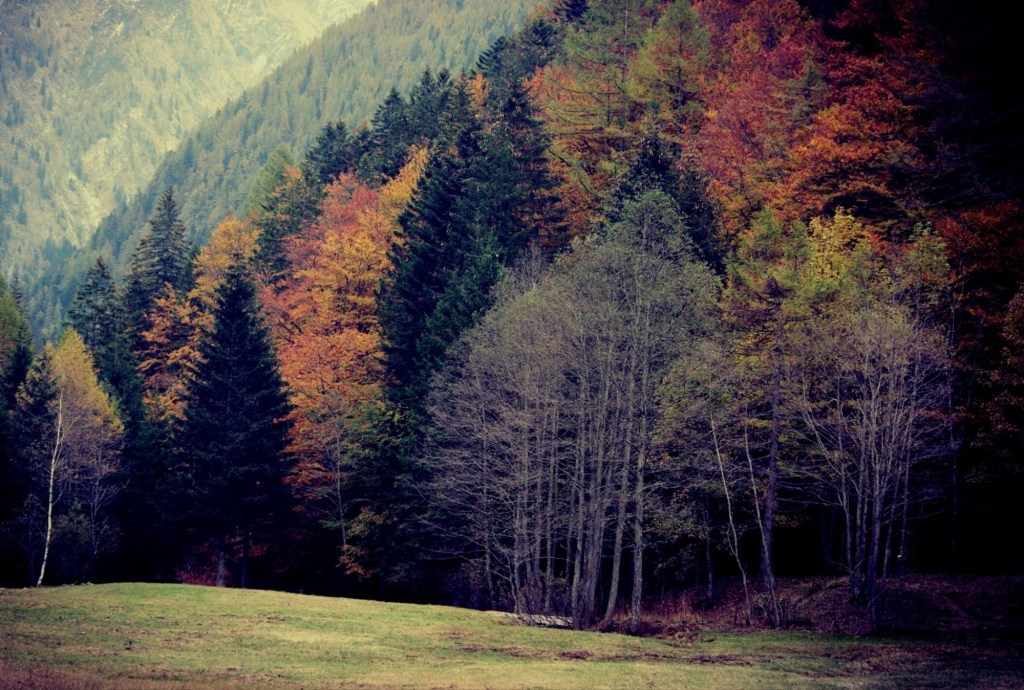 La luce qui è bassa anche perché piove quasi sempre. Le pinete i boschi e le foreste si preparano al bagno cromatico autunnale.