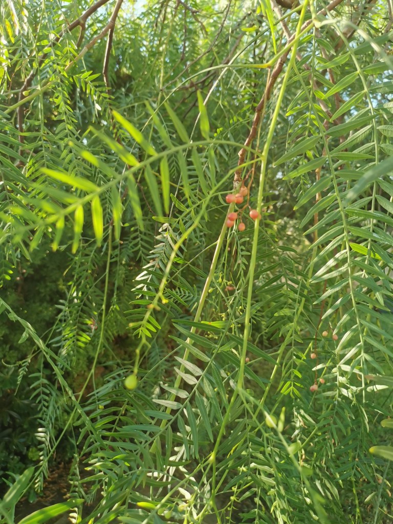 Nel giardino c’è questa bella pianta: è la pianta del pepe rosa. Se allargate la foto potete vedere le graziose bacche rosa. Il tronco si sviluppa in orizzontale