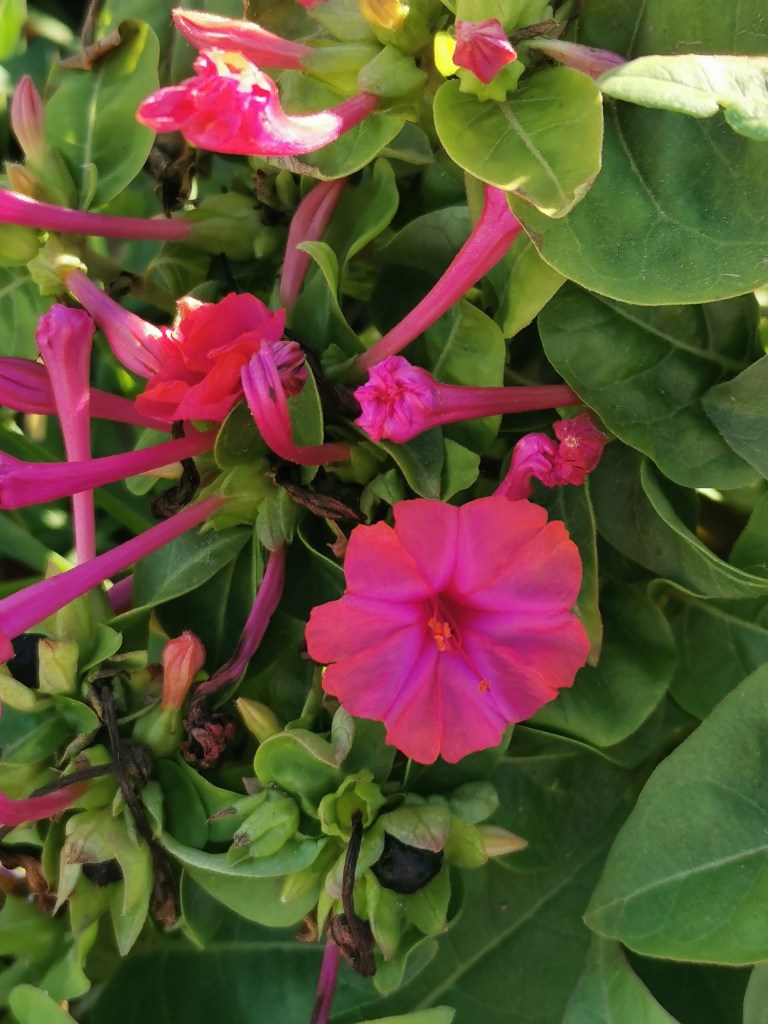 Questo bel fiore è la Bella di notte, così diversa dalla Bella di giorno che allieta la mia aiuola sotto le rose in montagna. Ma dallo stesso rosa shocking.