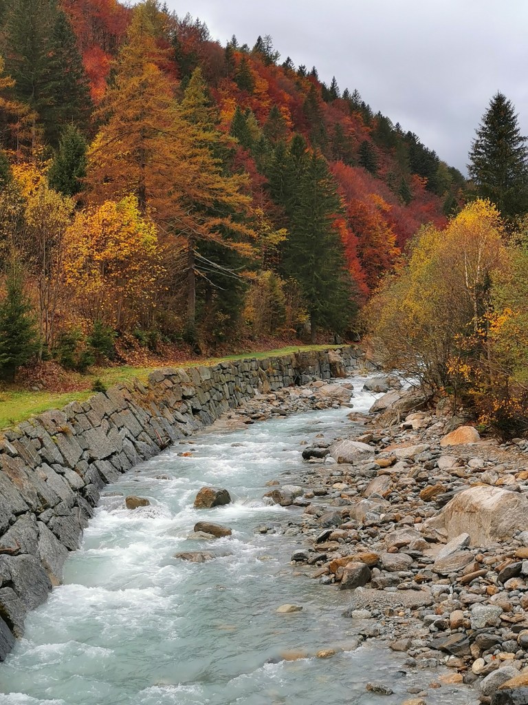 Che meraviglia, abeti, betulle, larici in grande spolvero, con una nota malinconica data dalle nuvole basse.