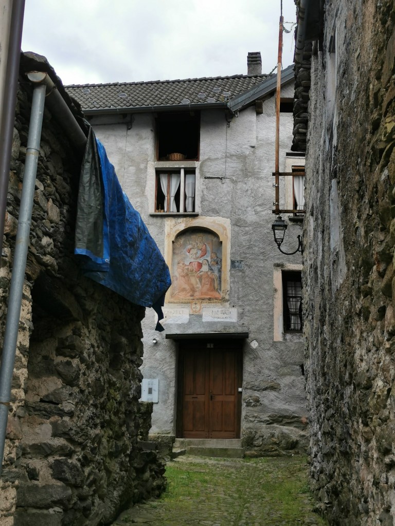 In una giornata buia basta prendere un’erta e salire salire salire per arrivare in un borgo buio, umido, di pietra e sassi che pare rimasto fermo all’Ottocento, se non fosse per il telo di plastica corredo indispensabile qui sui monti per coprire legname e quant’altro.