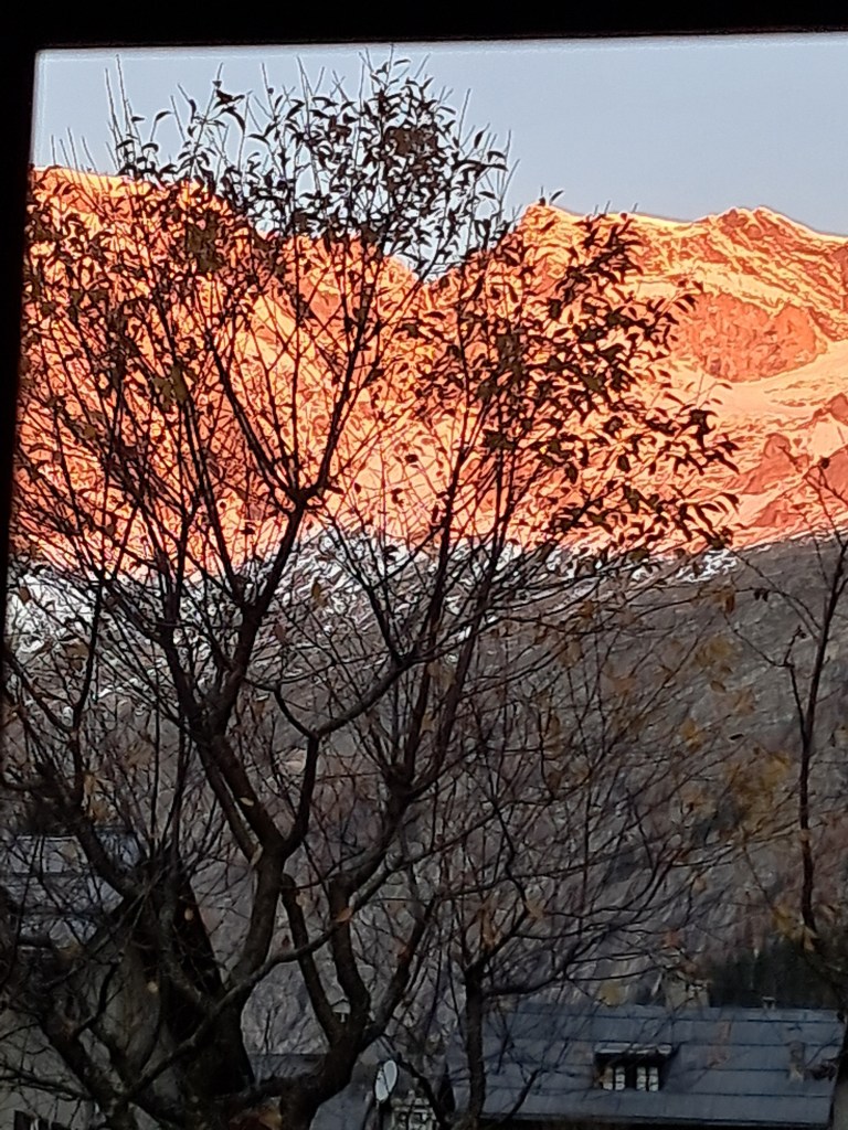 La mattina prima delle otto il Rosa è rosa. L’immagine è scattata dalla finestra cucina zona caffè. Fa molto freddo per uscire, ma lo spettacolo che si aggiunge al primo caffè della mattina è veramente suggestivo.