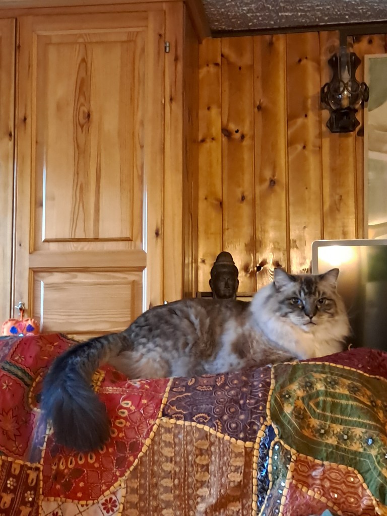 Ora la sua ispezione di ogni recesso della sala è terminata. Si è accoccolato sul divano. Regale. Immobile.