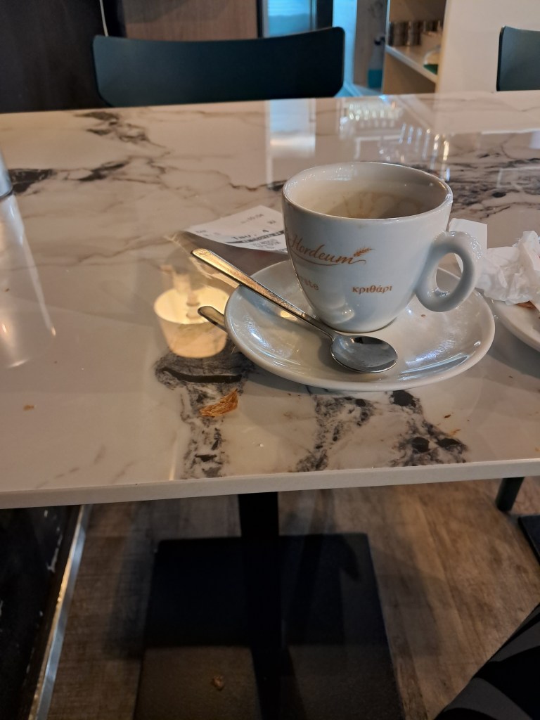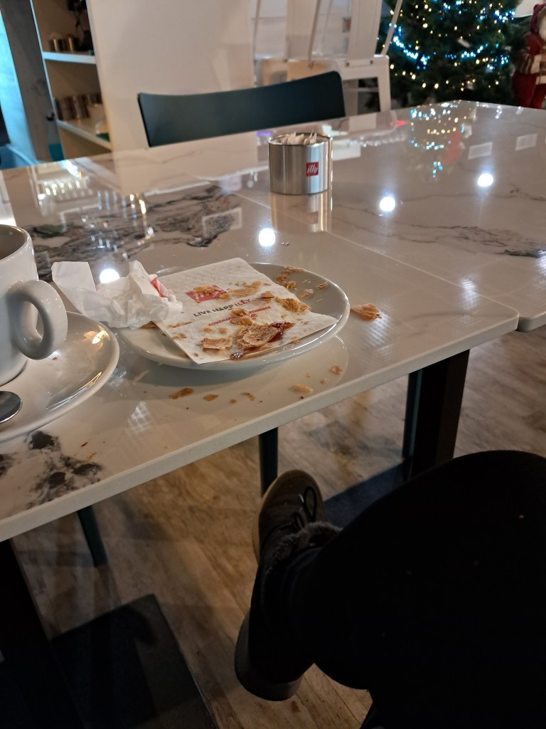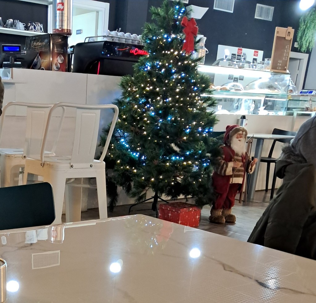Qualche volta scendo dal Monte e ritorno nella mia caffetteria preferita. Stamattina piena di gente. È una catena spagnola, personale simpatico e croissant che meritano.
