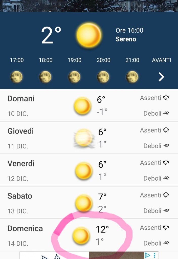 Comunque guardando le previsioni meteo della settimana ho visto che sabato danno nove gradi. A dicembre con gli alberi addobbati e le palline di natale nove gradi mi sembrano davvero troppo. Aggiornamento: ora domenica danno 12 gradi a 1320 metri di altitudine.
