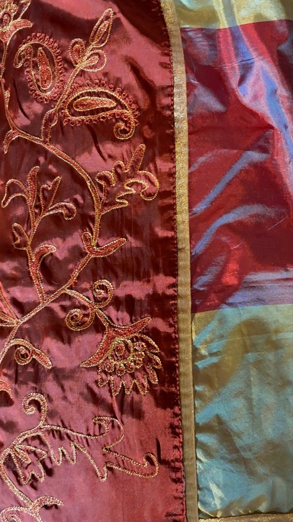 Ben detto! Anch’io mi libero di sacchi di abiti e affini, per donarli agli enti di beneficenza. Che splendido tessuto di broccato di seta, luminoso e cangiante!