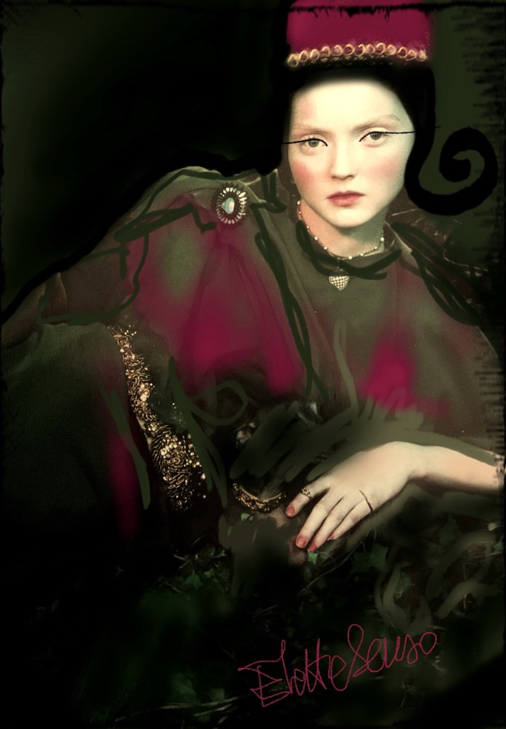 La donna vestita di scacchi rosso/oro ( accostamento cromatico malsano ) scuote le chiome corvine, poi si toglie il cappello rubino. Distende le unghie affilate imporporate mentre scodella la parola del giorno, il verbo:
