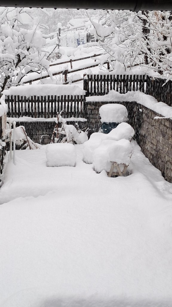 Queste le mie sedie da giardino dove fino all’altro ieri mi distendevo a prendere il sole. Visto che la foto è delle ore sedici e che continua a nevicare, mi sa che domani – quando pubblicherò questo post – saranno definitivamente sparite, inghiottite dalla neve.