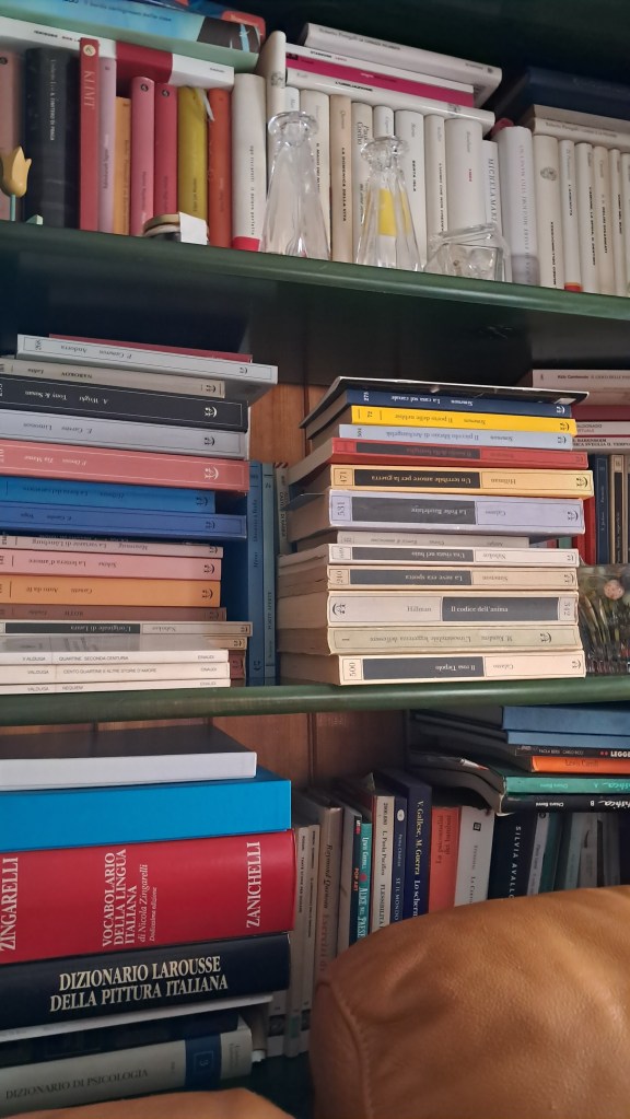 Così sosto in tutti i pezzi della mia biblioteca sparsa in casa, su e giù, a guardarli i libri, le copertine e i loro corpi. Ogni tanto ne acchiappo qualcuno: apro a caso, ripongo.